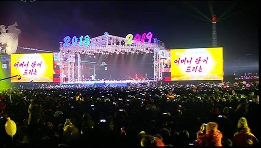朝鲜向各国大都会看齐,去年首度对外公开烟火秀,今年也准备了热闹的跨年秀迎接新年,搭建露天舞台表演歌舞,规模比去年还要大,台下群众手挥闪光棒,为台上的歌手打拍子。