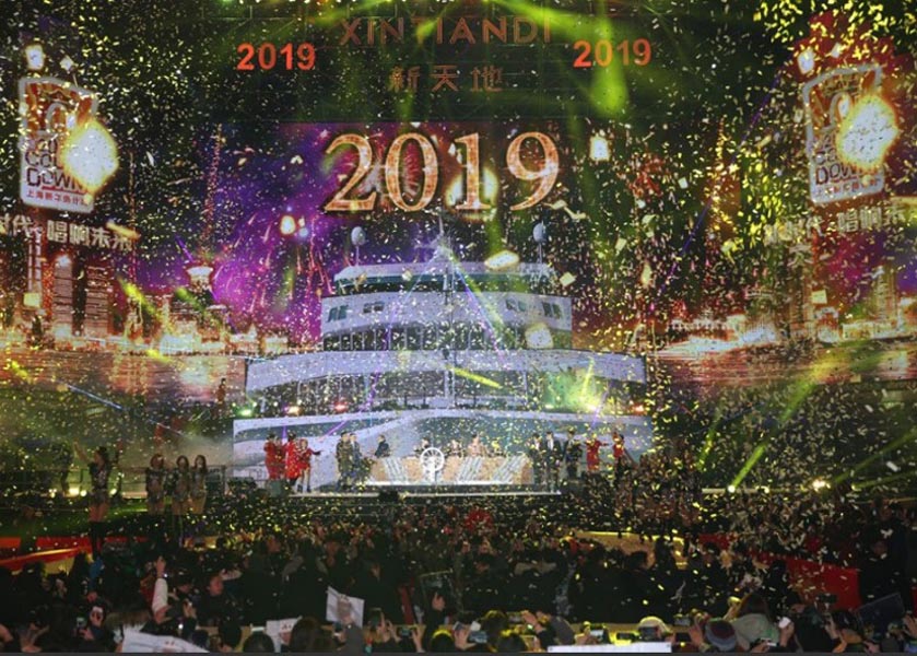 踏入2019年前后,中国多个省市的民众用不同方式送旧迎新。其中在周二,位于上海的新天地太平湖公园就有零点倒数仪式,大批民众到场见证新年来临;场下观众亦与台上表演者打成一片,气氛良好。