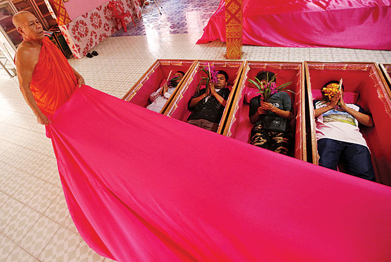 (曼谷1日综合电)当各国民众都在准备派对狂欢之际,泰国有一些人却用不一样的方式迎接新年,他们到寺庙躺进棺材,宛如为自己举行丧礼,象征送走旧的自己、挥别痛苦。