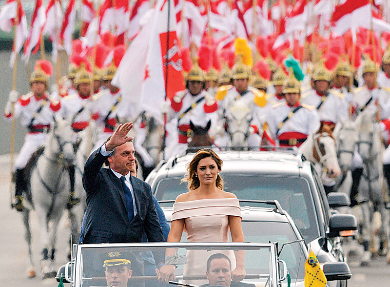 博尔索纳罗在第一夫人米歇尔的陪伴下,乘坐黑色开篷车巡游。(法新社照片)