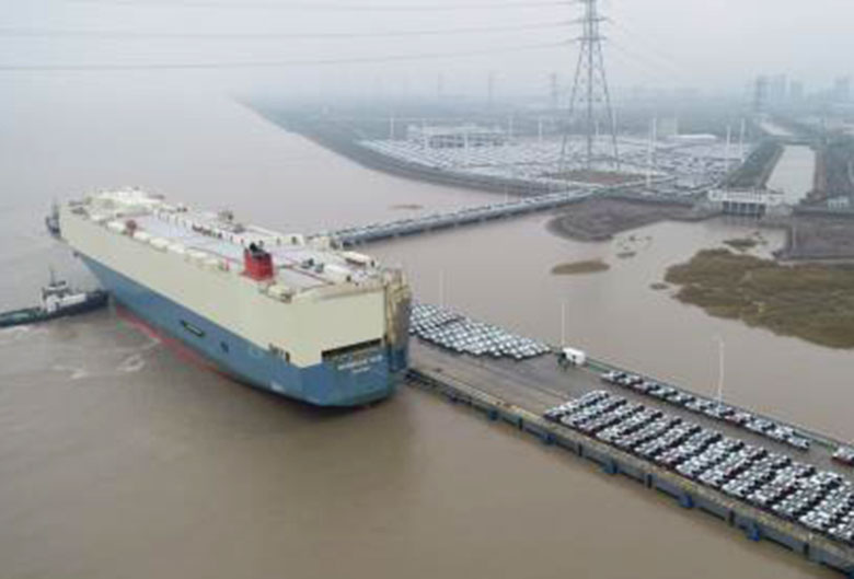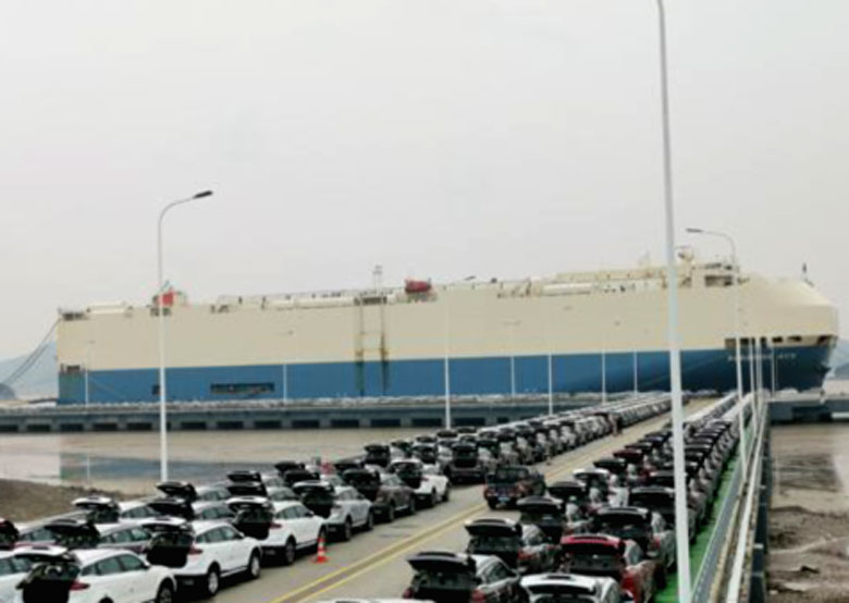 (宁波4日综合电)在浙江宁波舟山港梅山港区梅西滚装码头,周四一辆辆崭新的国产汽车井然有序地驶入“天堂精英”滚装船中。据悉,该船将装载这批共2300辆吉利汽车出口至马来西亚。