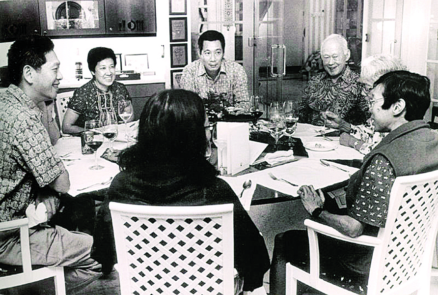 李光耀家人2001年共进晚餐。李光耀(右2)左手边起坐着妻子柯玉芝、女儿李玮玲、长孙女李修齐(背对镜头)、幼子李显扬与妻子林学芬(位置被遮挡)、长媳妇何晶及长子李显龙。