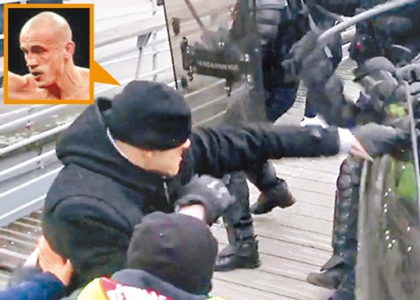 (巴黎8日综合电)法国巴黎上周六(5日)再爆发黄背心示威,其中一名示威者赤手空拳攻击持盾警员,事后被认出是曾于2007年赢得法国轻重量级拳王的德廷格。他周一(7日)放弃逃亡选择自首,随即被警方拘捕。法国总理菲利普同日表示,计划镇压这场没有授权的示威并处罚涉事者,下周末将部署8万警力。