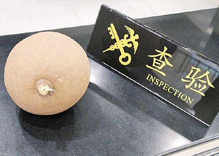 该旅客当日入境澳门时,其行李箱在拱北入境大堂过X光机检查,被发现内有一个不知名的茶褐色球状物体,引起关员注意。经查,该水果证实是炮弹果,直径约20厘米,重3.8公斤,外壳坚硬。该名旅客声称,果实来自新加坡,是他的新加坡友人在家中种植并送给他。因这种果实相当罕见,故他准备带入境与家人一起食用。