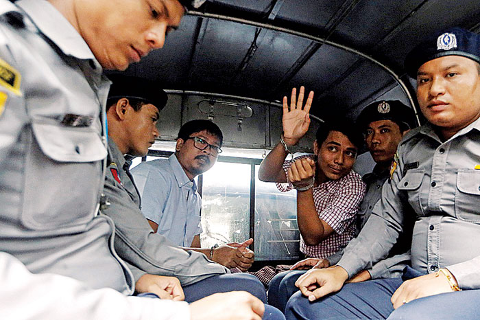 28岁的觉梭吴与32岁的瓦隆前年调查缅甸若开邦多名罗兴亚人疑遭军方集体杀害,应约与警察会面,取得相关文件后当场被捕。