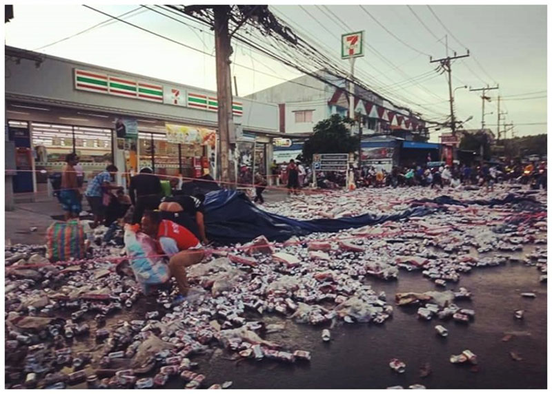 泰国警方清晨6时接报到场,只见大批市民不遗余力地疯抢啤酒,又用麻包袋装起带走,当时未有交通警在场指挥,只有少数人协助清理街道,路面一片狼藉。