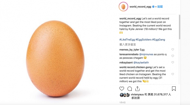 社交名媛凯莉詹娜(Kylie Jenner)是原纪录保持者,她去年2月6日宣布诞下女儿斯托米时,贴文获得1800万个like。本月4日,一位网名为“world_record_egg”的用户,在Instagram贴出首篇贴文,只是一幅普通褐色鸡蛋照片,附文写着:“请大家一同破纪录,成就最多人like的贴文,打破Kylie Jenner纪录!”