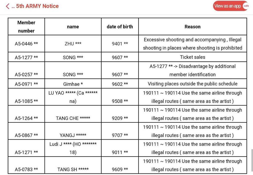 经纪公司使出大绝招,不仅公开姓名、生日,还公开这些人经营的粉丝站帐号,并在每一位名字后方清楚注明违规内容,最明显的是其中5位私生饭,原因都是在BTS赴日期间透过非法管道得知团员班机,并刻意购买和成员们邻近的座位区域,造成团员们不便。