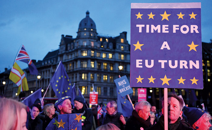 而在国会外,脱欧派和留欧派民众在英国国会外示威,留欧派挥舞欧盟旗帜,呼吁举行第二次公投;脱欧派则高举“脱欧就是脱欧”、“没协议?没问题!”等口号牌,指摘反对者是“叛徒”。