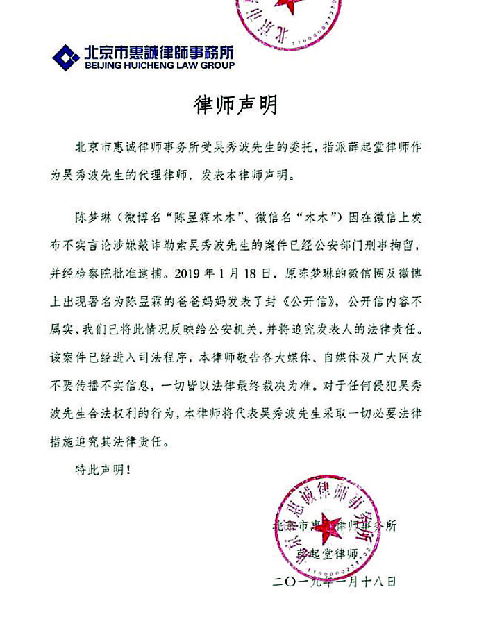 吴秀波律师信声明,陈昱霖父母公开信不属实,将追究法律责任。