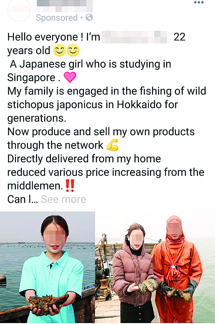 张女士受访时说,她3周前浏览脸书,看到一名自称在新加坡留学的22岁日本女生的帖文。女生声称家人在北海道以养殖海参为生,今年首次开设脸书网页推销北海道刺参。