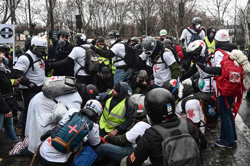 巴黎数以千计示威者周六在严寒之下,举起要求马克宏下台和抗议警方暴力执法的纸牌请愿,还高呼“巴黎人站起来”的口号,呼吁民众加入示威行列。