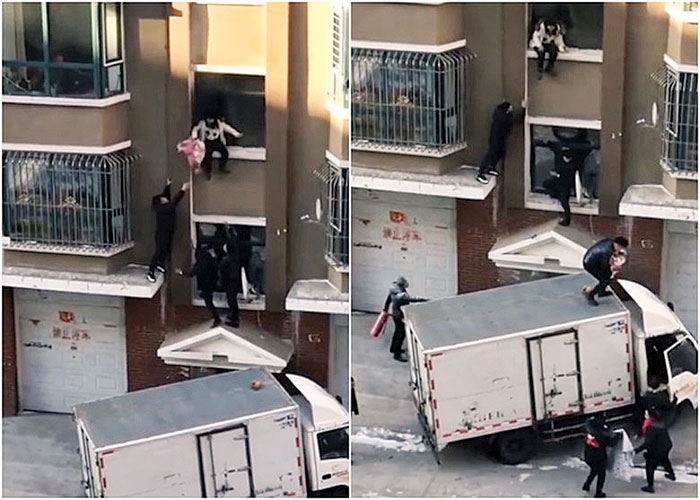 从网传短片可见,该名母亲当时危坐在窗边,多名邻居见状,立即爬上一楼平台,准备营救。