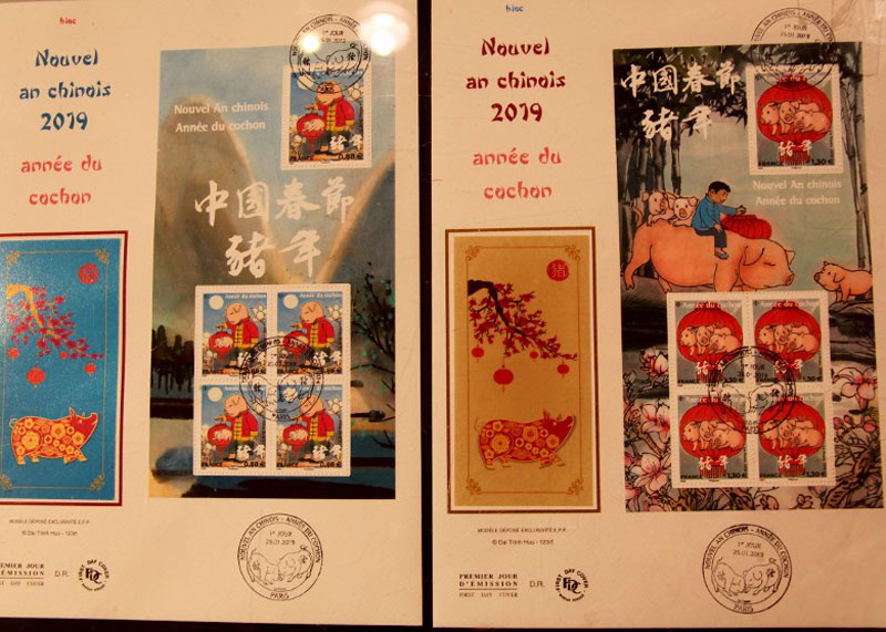 中国驻法大使翟隽、法国邮政总裁瓦尔、法国邮政亚太非美国际关系部主任金岩等出席当天在巴黎举行的邮票发行仪式。这次发行的猪年生肖邮票共两枚,面值分别为0.88欧元和1.3欧元,同时还发行两张小全张,分别包含5枚邮票。小全张上印有中文“中国春节猪年”的字样。