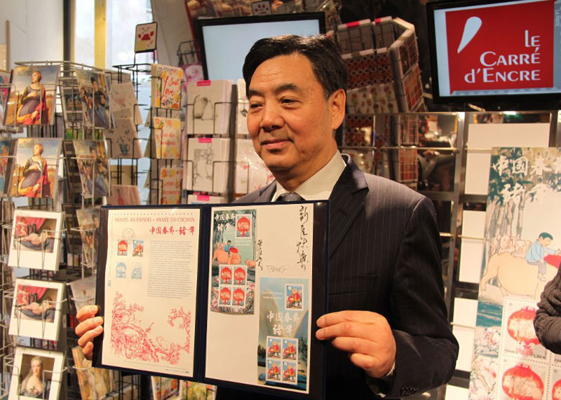 法国邮政总裁瓦尔则表示,中法邮政部门有良好合作,法国已经连续发行了一轮生肖邮票,今年发行的猪年生肖邮票也非常精美。他说,书法和绘画是中国艺术的高级形式,今年的生肖邮票也很好体现了中国的艺术。
