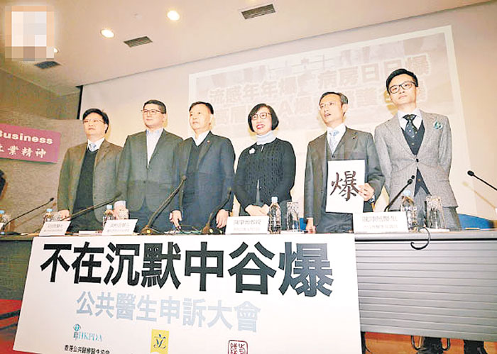 公共医疗医生协会、前线医生联盟,以及医学界立法会议员陈沛然,周六下午举行“不在沉默中谷爆”申诉大会,食卫局局长陈肇始、副局长徐德义、医管局行政总裁梁柏贤等亦有出席,听取医护人员意见,大批出席人士举起印有“爆”字的纸张,表达当局没有正视病房逼爆等问题,而人手不足令工作量大增,是会上焦点。