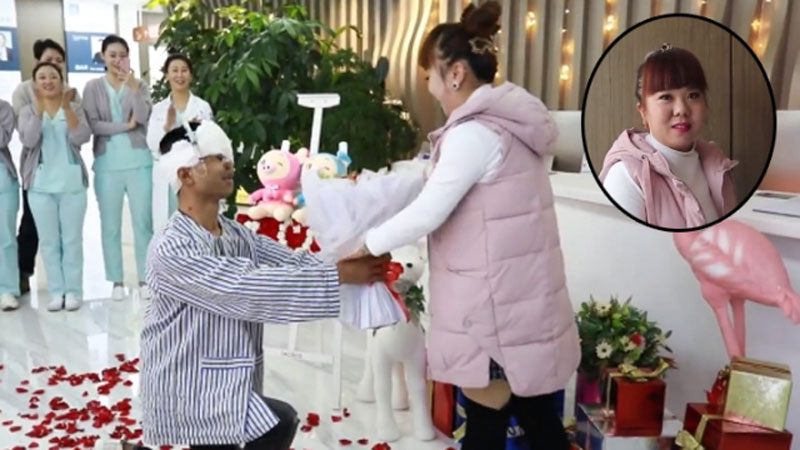 据报道,因一场车祸而导致“面目全非”的贾占朋,日前再度在北京朝阳区一间整形医院接受整容手术。其间,贾占朋鼓起不知从哪里来的勇气,在铺满花瓣的医院大堂,向女友笑笑献上鲜花跪地求婚。一句“嫁给我吧”,便赢得美人归。在旁围观的医护人员,随即给两人鼓掌。