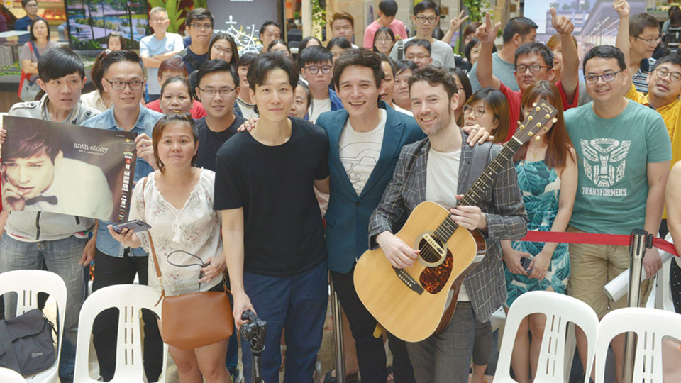 倪安东和音乐团队,包括韩籍导演Fred(左)以及制作人白巧克力(James)开心与歌迷合照。