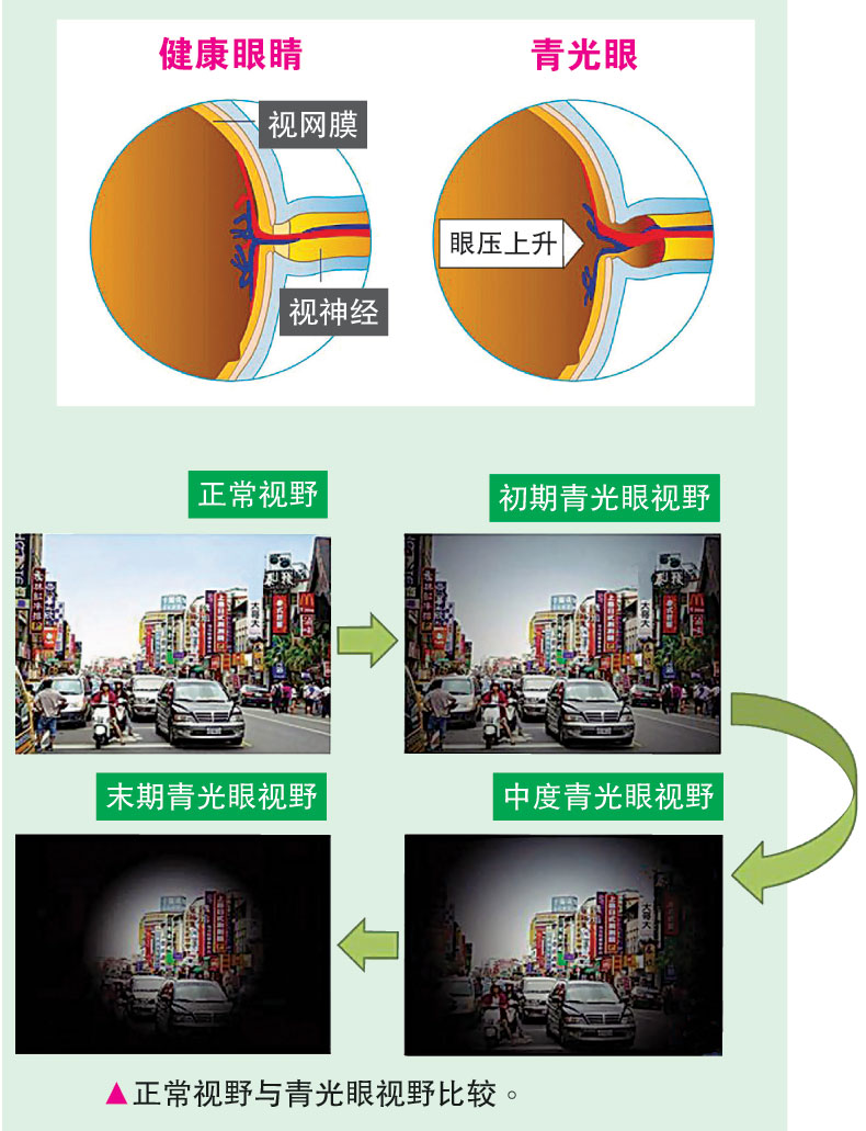 青光眼俗称“绿内障”,主要是因眼球内房水无法顺利排出,导致眼压增高,进而对视神经纤维产生压迫,长时间后造成不可逆的伤害而失明。