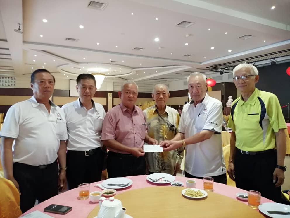 郭海强(左3)移交8000令吉赞助基金予谢达祥接领,左起郭镇钦,郭子仁,钟金成及李群波见证