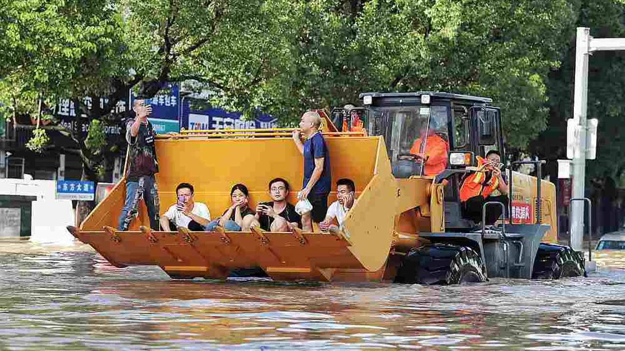 在浙江省台州市,救援人员用推土机将灾民运出重灾区。
