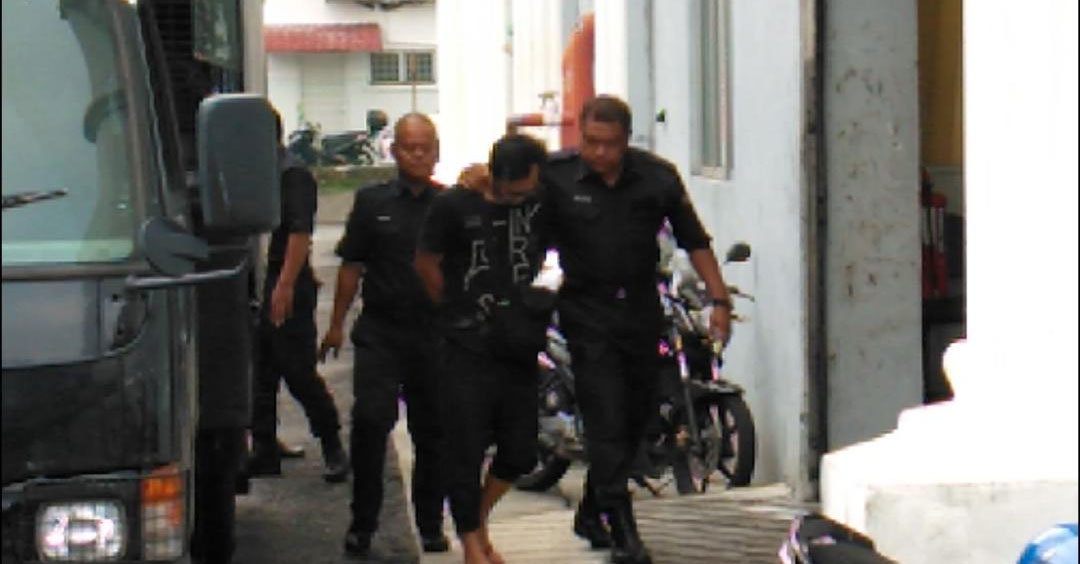 疑犯身穿黑色T裇、长裤与拖鞋,携带皮包,双手被反扣,在两名警员的陪同下,被押送进入法庭拘留所。