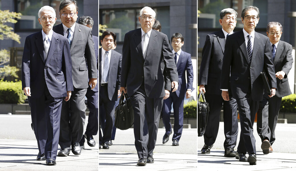 东京电力77岁前会长胜俣久(左)、69岁前副社长武藤荣(中)和73岁的前副社长武黑一郎。
