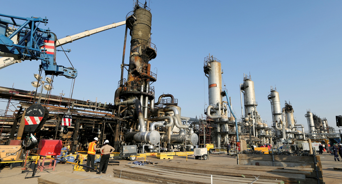 沙地阿美石油公司的胡赖斯油田正展开修复工程,工作人员在已烧得焦黑的稳定柱周围,架起起重机。