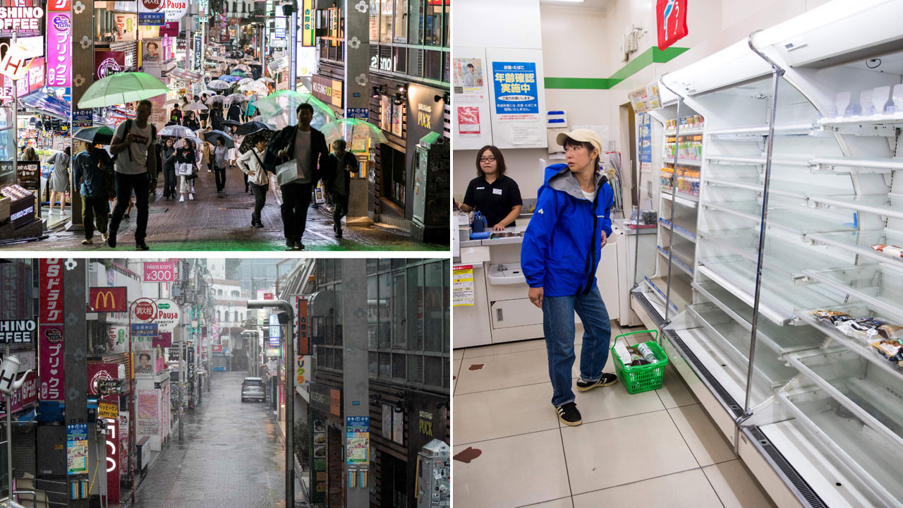 (左)平日车水马龙的东京街头异常冷清。(右)民众采购大量日常用品。(法新社照片)
