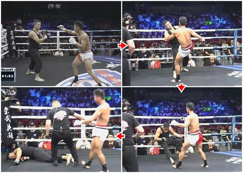 广东江门市上周六(19日)晚举行了一场万众期待的自由搏击比赛,由被誉为“咏春实战大师”的丁浩,迎战绰号“阿虎”的搏击选手陈锦云。然而在这场“大战”中,丁浩仅在擂台上坚持了74秒,即被阿虎一记高腿扫中头部KO,丁浩当场倒地昏迷不醒。