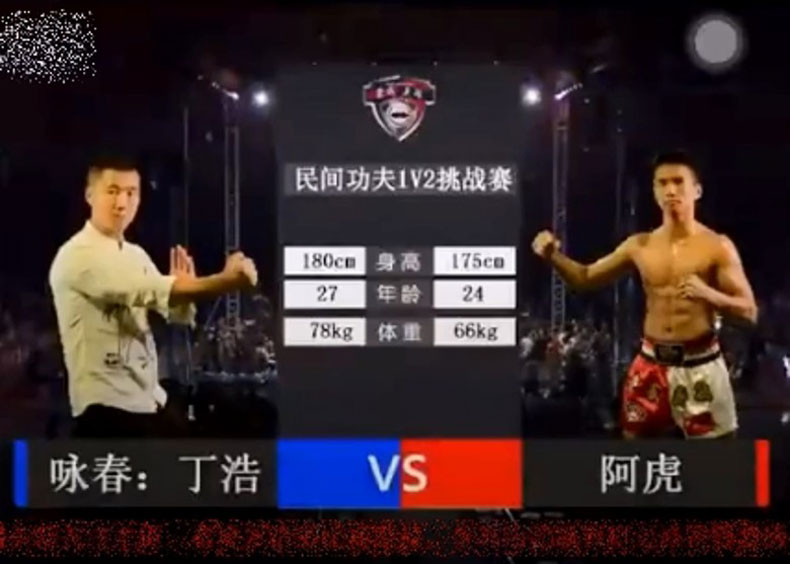 该场名为“崇武英雄世界自由搏击对抗赛”的赛事,由中国咏春大师余昌华大弟子丁浩,对战“江春鹏雄狮拳馆”的搏击手阿虎。据悉,丁浩曾在赛前表示,此次参赛旨在证明传统武术咏春的实战能力。