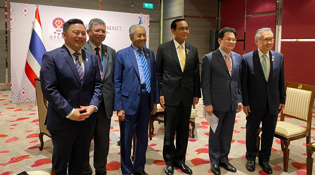 马哈迪(左3)率团出席东盟峰会,并与巴育及泰国官员进行会晤。