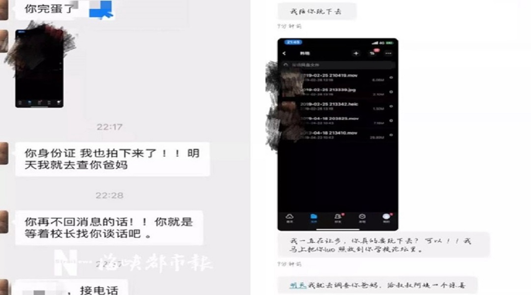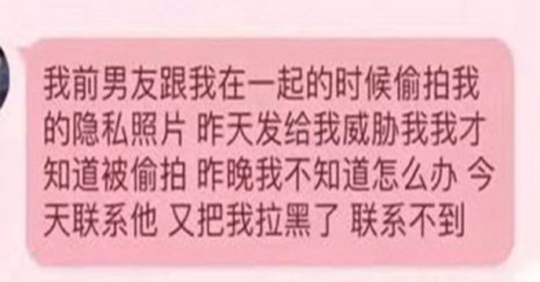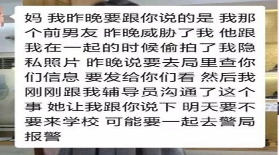 根据报道,小静通过网上游戏认识了该名26岁前男友,其后发展成恋人关系,交往已一年多。日前小静发觉郑男出轨,二人发生争执,小静更将郑男出轨事情曝光到微博里。于上月17日,郑男发信息给小静称,“马上把你的裸照发到学校论坛里”、“在学校看我怎么抓你”、“这就去调查你爸妈,给叔叔阿姨一个惊喜,如果再不回消息,就等著校长找你谈话”。