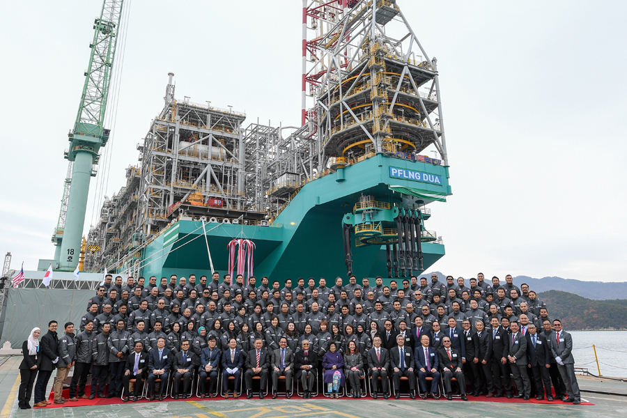 这艘船长393公尺,周三正式命名为PFLNG Dua,马哈迪伉俪在仪式上主持剪彩。