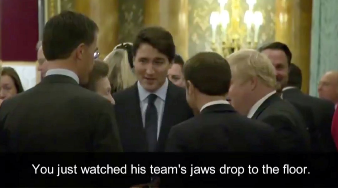 片中可以听到约翰逊问马克宏︰“那就是你迟到的原因吗?”杜鲁多插嘴说︰“他(马克宏)迟到是因为开了40分钟的记者会。”似乎在取笑特朗普。