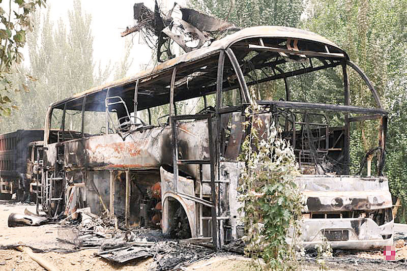 新华社公布一系列照片,介绍二〇〇八年至二〇一四年新疆暴恐事件。图为二〇一四年七月廿八日在喀什莎车县发生的恐袭事件,造成三十七人死、十三人伤,三十一辆车被打砸、焚烧。