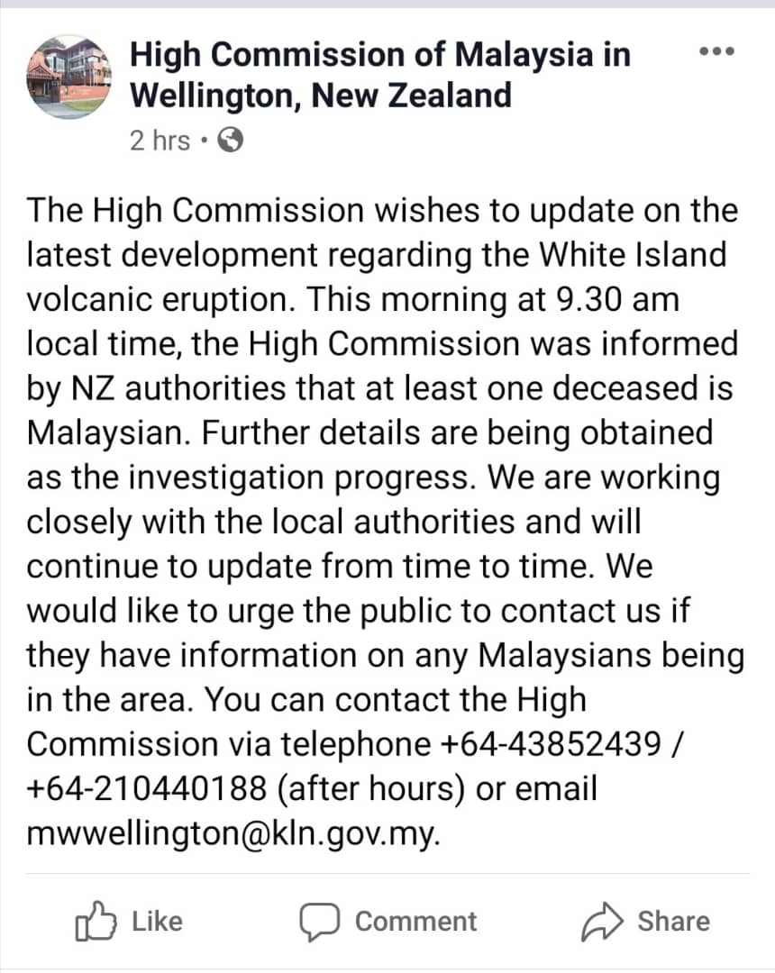 纽西兰旅游景点怀特岛的火山于当地时间9日爆发,至少1名死者是大马人。