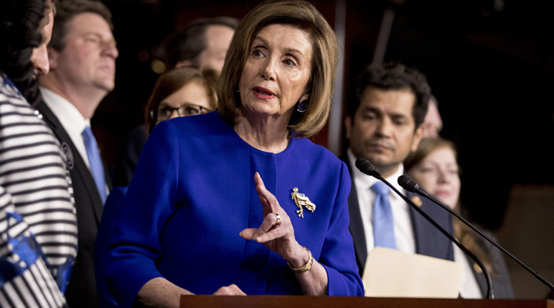众议院议长民主党的佩洛西,连同众议院多个委员会主席见记者。