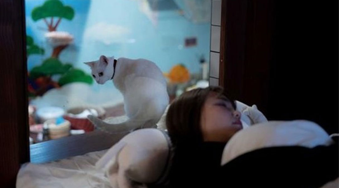 床头前的透明玻璃微妙地将人猫隔开,由于住客可隔着玻璃逗猫,所以哪怕是对猫过敏的人都可安心入住,一尝‘吸猫’之乐。