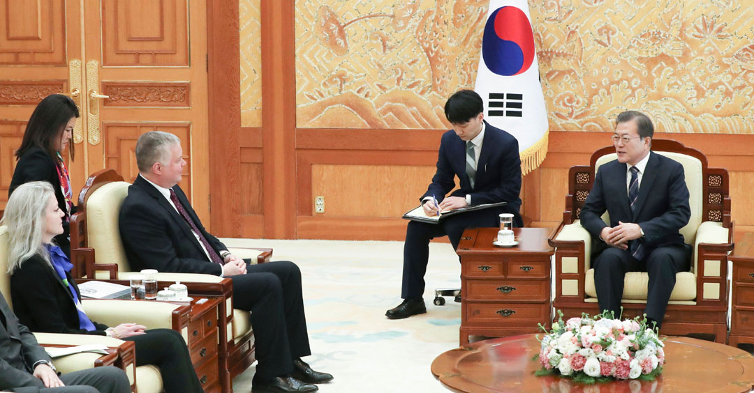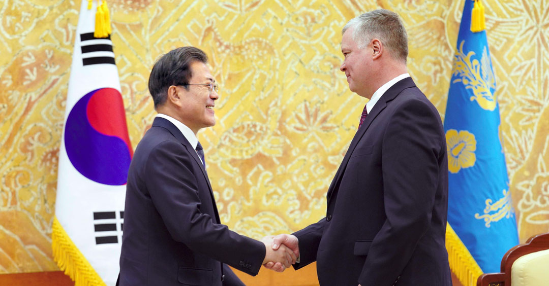 文在寅(左)与访韩的美国朝鲜政策特别代表比甘互相握手。(法新社照片)