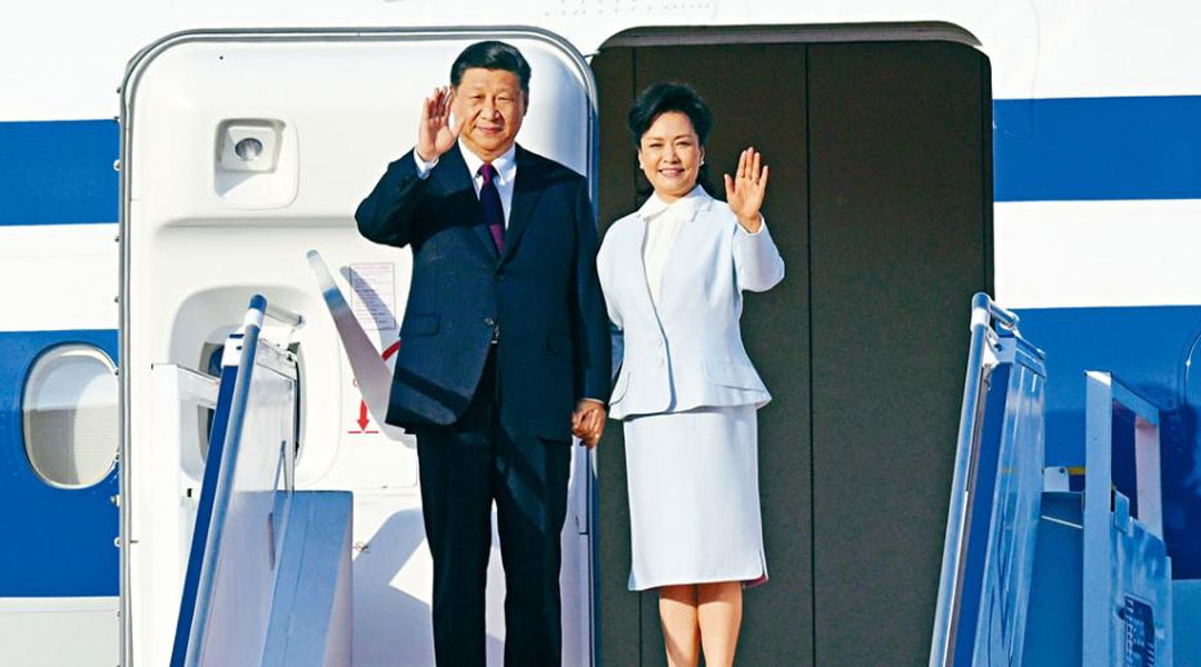 中国国家主席习近平与夫人彭丽媛踏出专机,向欢迎人群挥手致意。