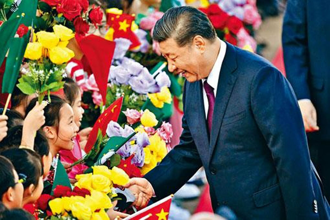 习近平伉俪与他们逐一握手,又接受小孩献花。在场亦有小童挥动国旗、澳门区旗和鲜花,欢迎习近平到访。