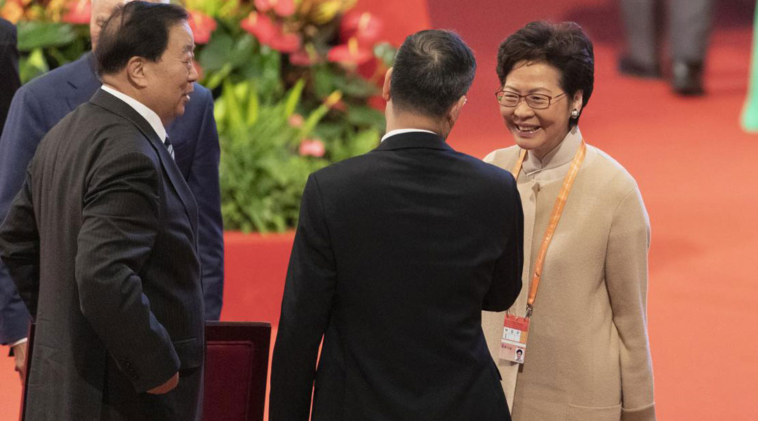 香港特首林郑月娥(右)周五出席庆祝澳门回归20周年大会,并跟与会者寒暄交谈。