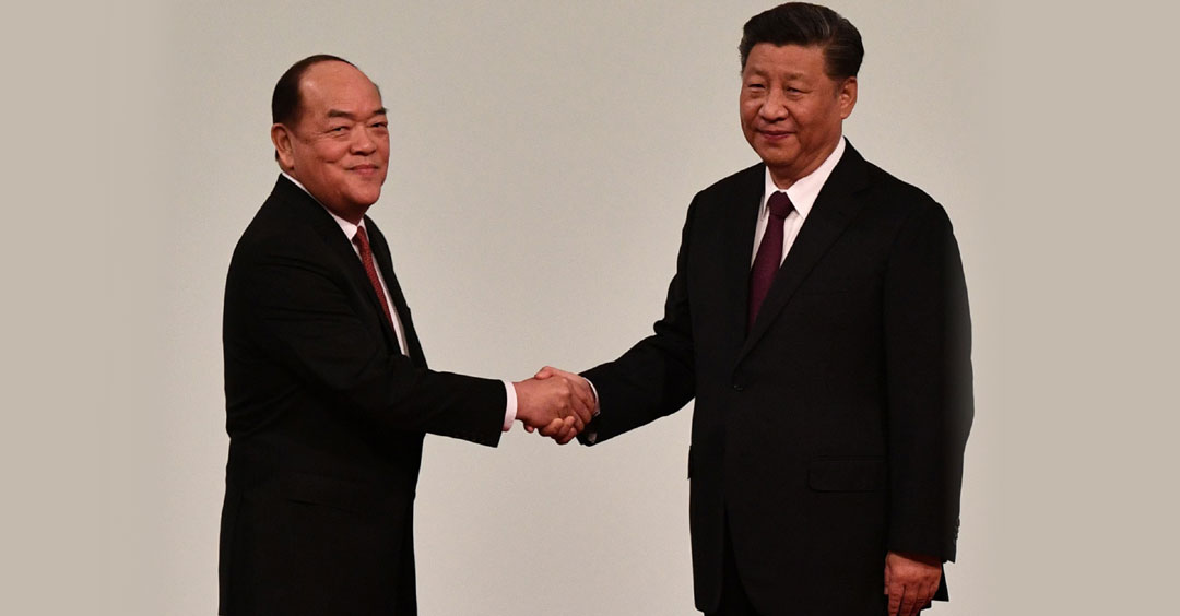 贺一诚在习近平监誓下,宣誓成为新一任澳门行政长官,两人随即握手。