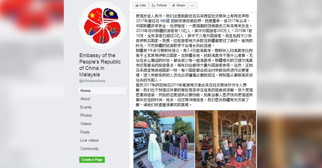 “我们注意到最近在马来西亚社交媒体上有网友声称2017年曾经在新疆因做祈祷而被扣押,我想重申,自2017年以来,中国新疆非常安全,也很稳定,一度猖獗的恐怖袭击3年来再未发生。”