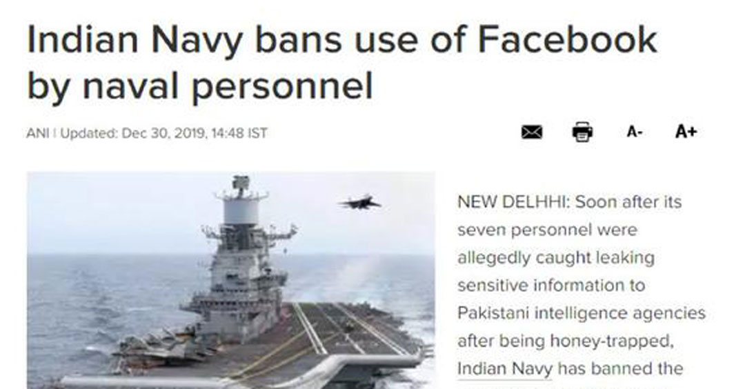 按照《印度时报》等印度媒体的说法,印度海军前几天侦破了一起还挺严重的“间谍案”,说是有11名印度海军的士兵,被巴基斯坦情报部门在社交网络上设置的“桃色陷阱”给忽悠了,不仅被“虚假的美女账号”勾搭了,还将自家的一些军事秘密,都告诉给了对方。