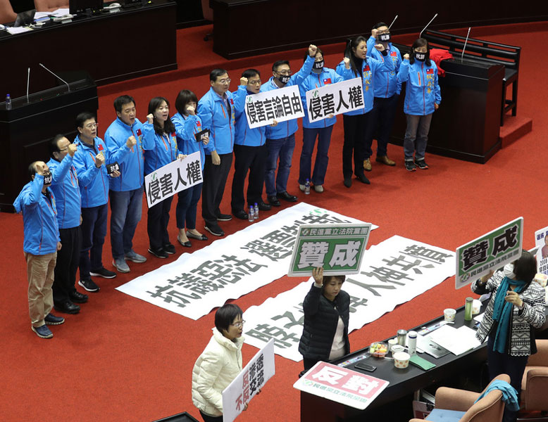 国民党籍立委在场内表达抗议及不满。《反渗透法》。(中央社照片)