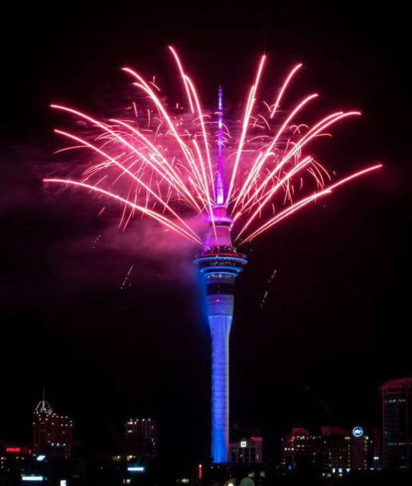 在纽西兰奥克兰天空塔的塔尖,一束束烟花接连绽放,不远处的海湾大桥也亮起了彩灯,人们穿上了最闪耀的服饰,跳着舞迎接新年的到来。