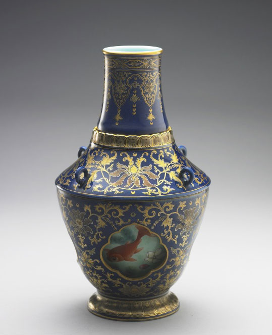 至于“清乾隆霁青描金游鱼转心瓶”分内外两层,握器颈旋转,透过外瓶的开光可看见内瓶绘制的水草和游鱼优游与眼前,宛如走马灯。文资局的指定理由表示,传世40公分以下的转心瓶多半收藏于故宫,此品不仅代表院藏之特色,同时也因品相端整、稀珍罕见,显其珍贵。