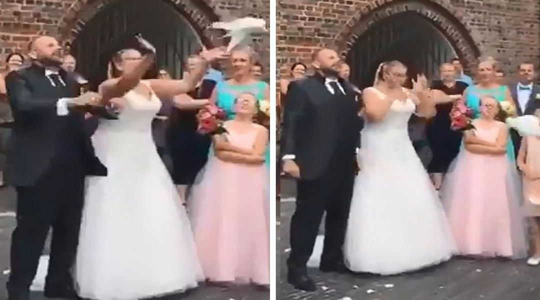 一对新人一起放生白鸽,怎料却发生意外一幕。
